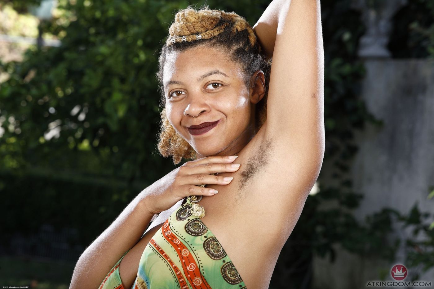 - Description: Oya loves to show off for the camera. This ebony hairy babe is all natural. She wears colorful dreadlocks and strips out of her skirt. She very sensually rubs her body in this video.