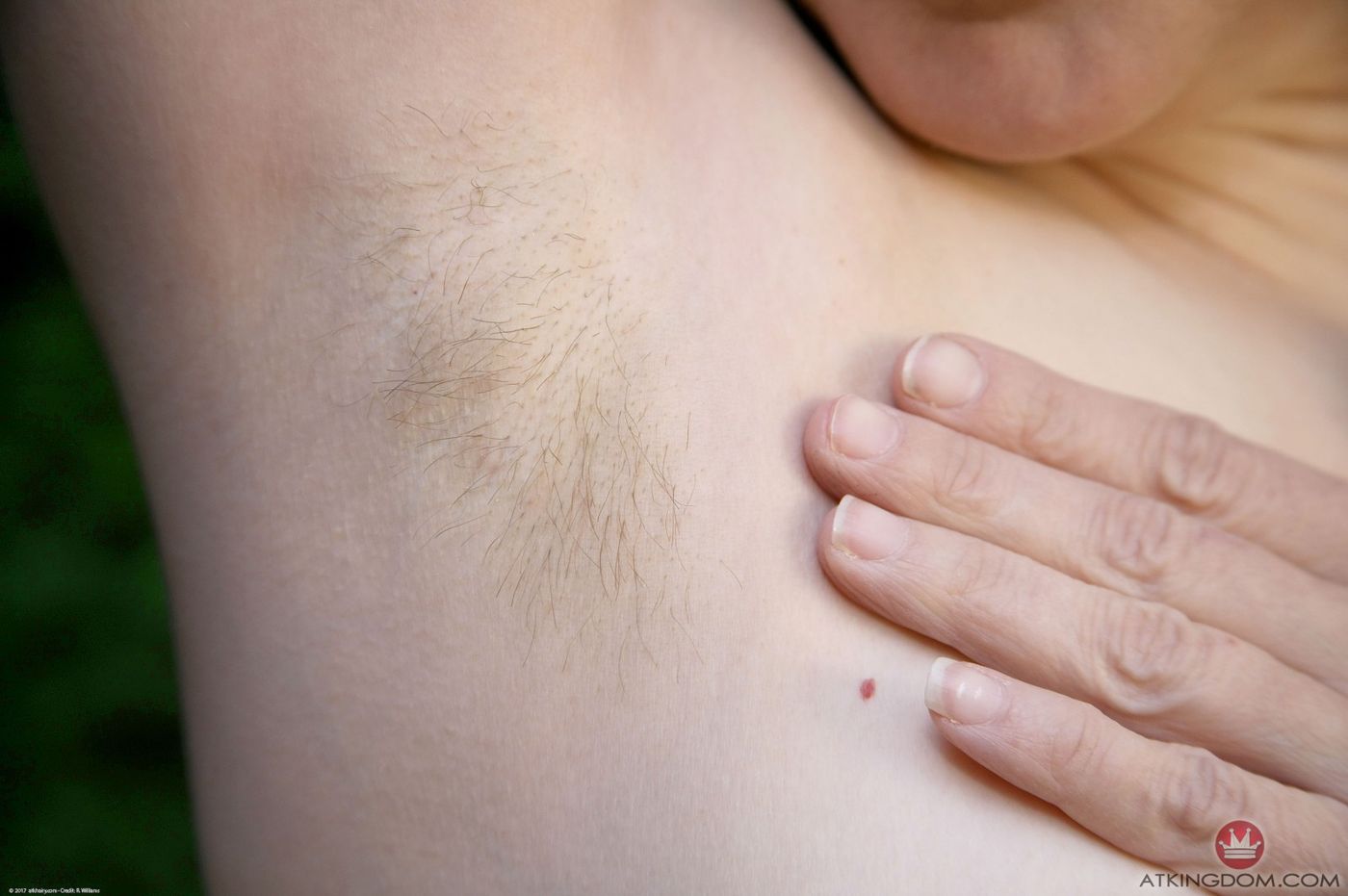 Natural hairy babe Trixie strips outside and plays with her pussy
